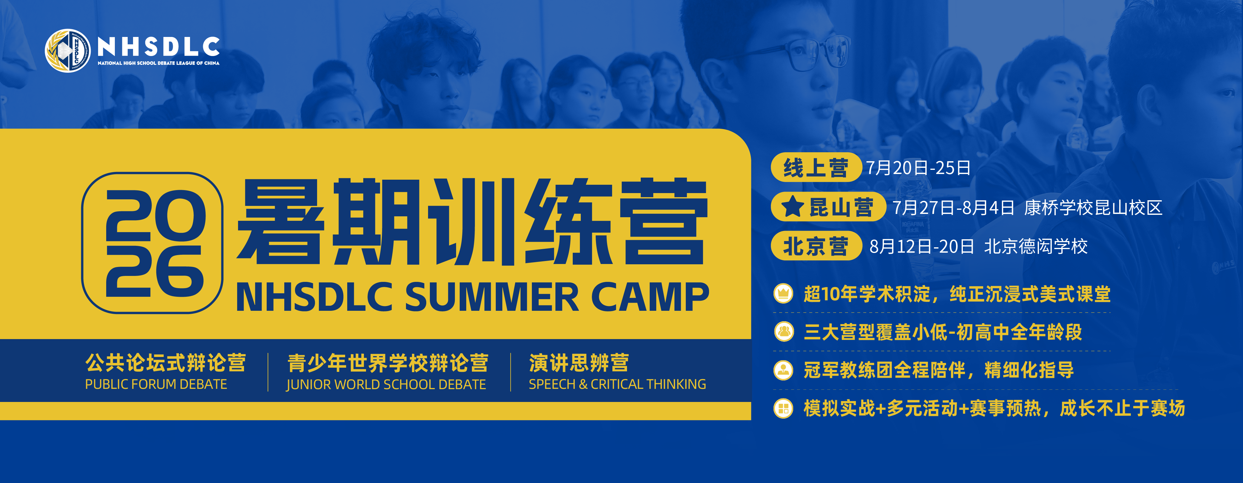 NHSDLC全封闭式美式辩论训练营,通过结合课程、实训与趣味活动,为学生提供高强度、快节奏的辩论与演讲能力训练。